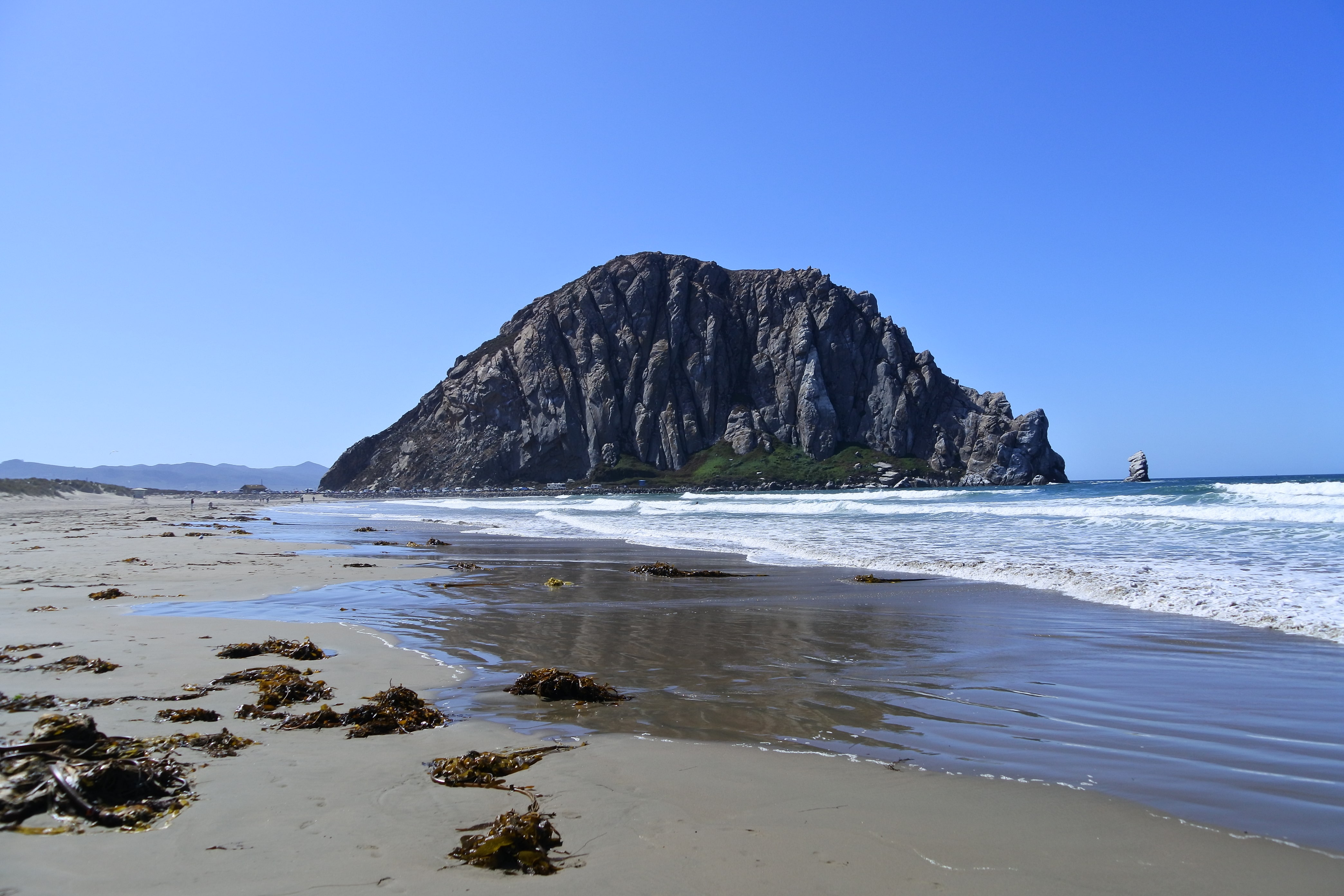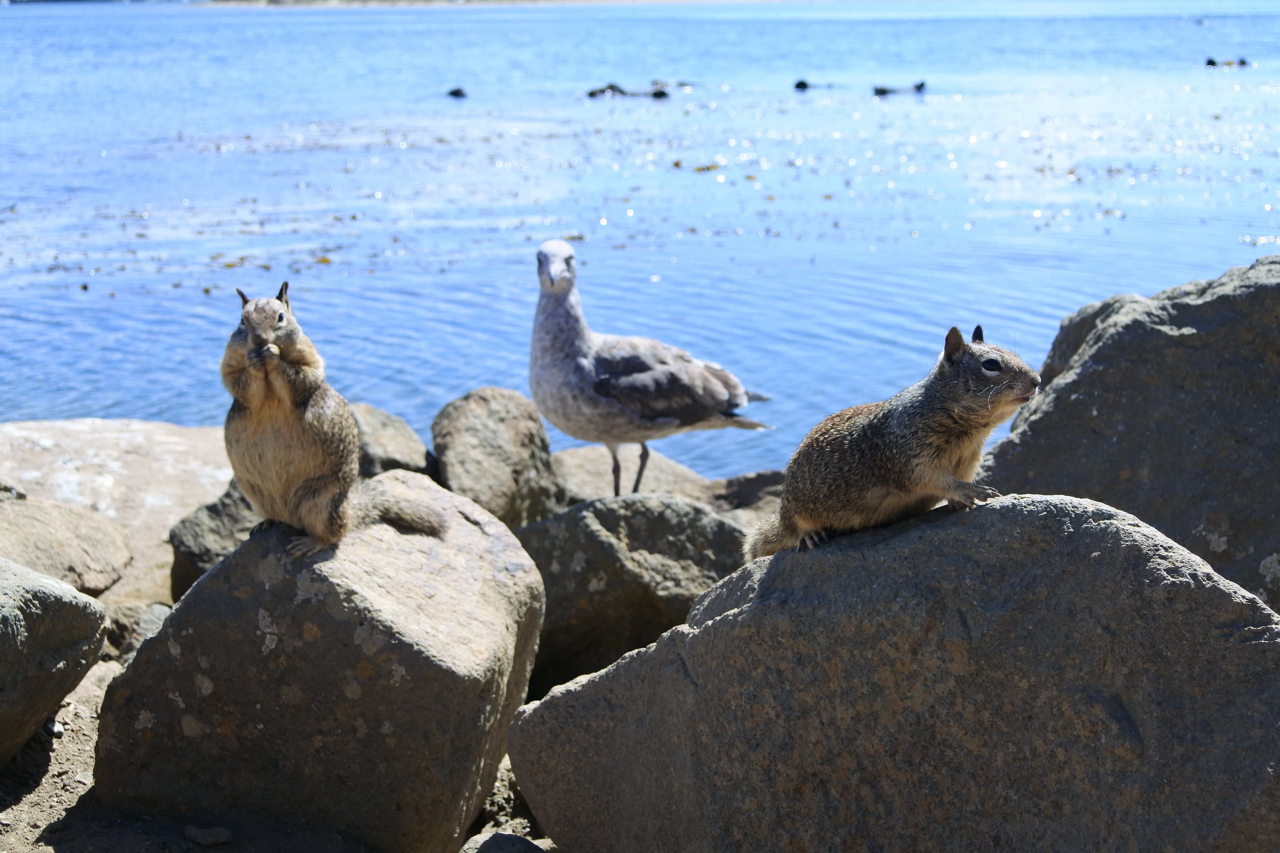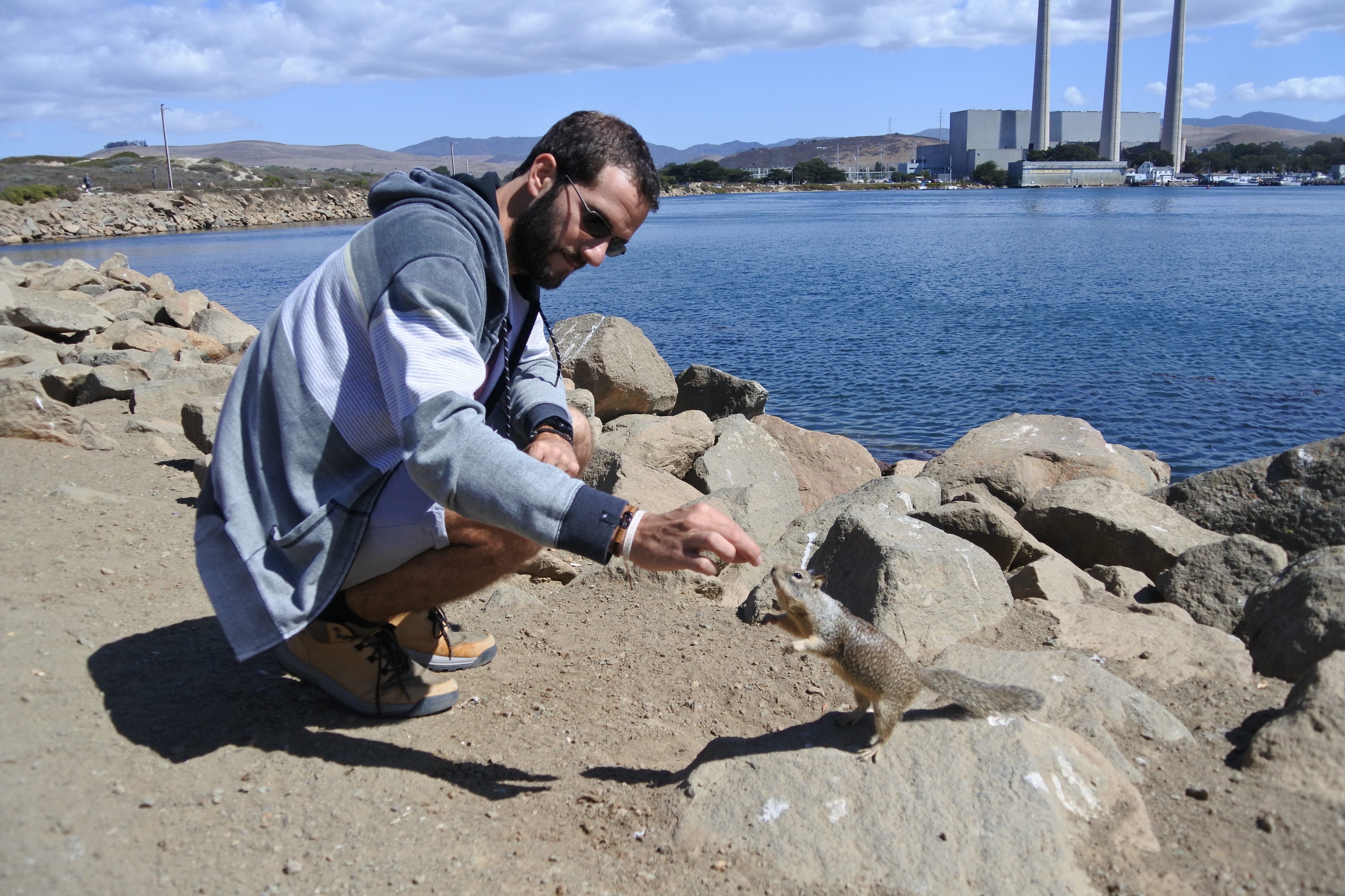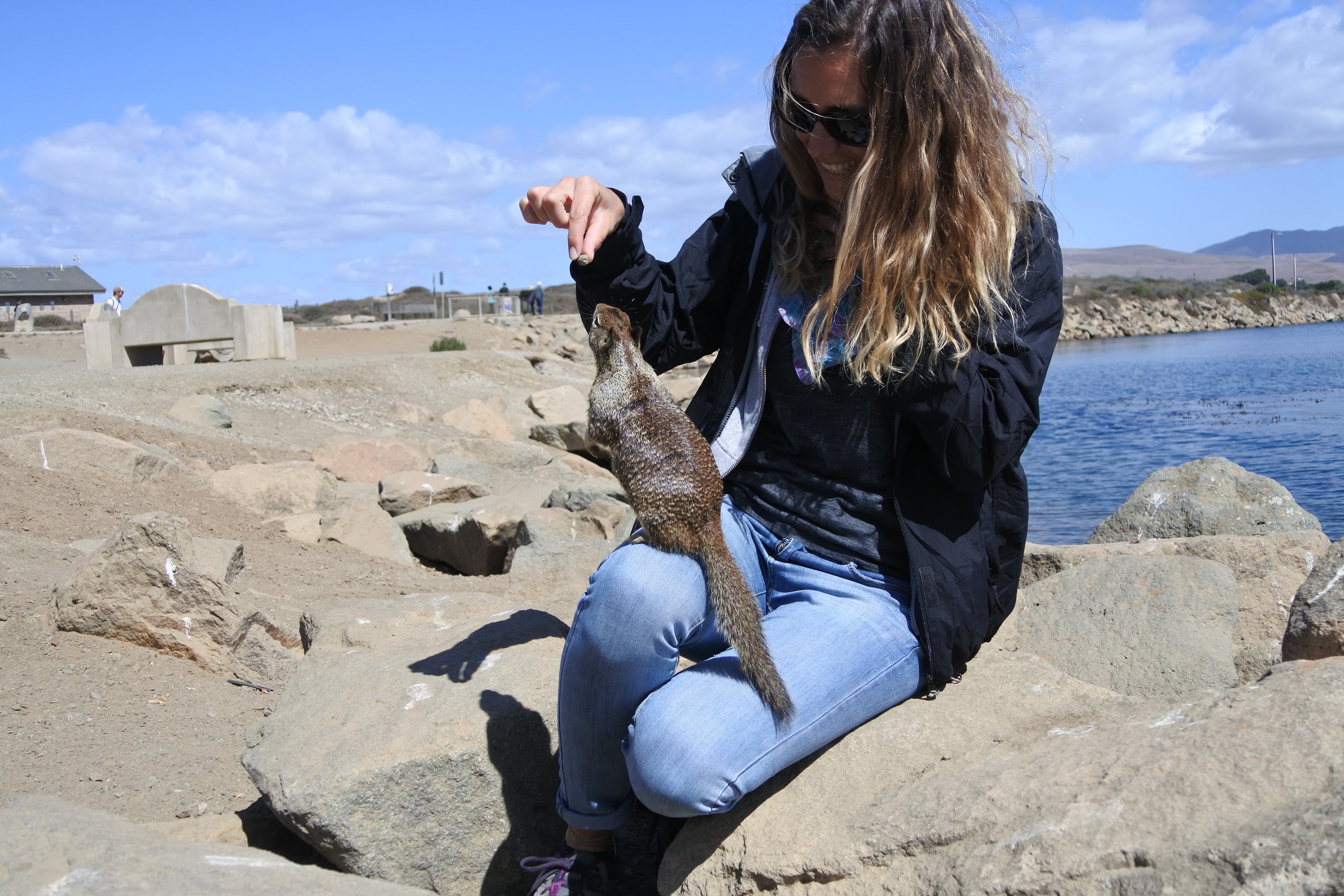 Aujourd’hui plusieurs étapes nous attendent. Le premier arrêt nous amène à Morro Bay sur une très grande (et très tranquille) plage au pied d’un énorme rocher. En soi rien de très particulier mais si on s’approche de l’eau de l’autre côté du parking, on peut apercevoir quelques loutres de mer qui semblent s’amuser comme des petites folles dans les algues ! Nous n’avons pas pu bien faire connaissance avec elles car elles sont restées assez loin du rivage, mais ce sont les tâches noires sur les photos. En revanche, ceux que nous avons pu voir de très près ce sont les nombreux petits écureuils qui circulent entre les rochers à la recherche des généreux touristes qui acceptent de partager leurs provisions. Le moins qu’on puisse dire c’est qu’ils ne sont pas timides ! Ils sont craquants, mais on se demande encore si ce sont simplement de gros écureuils qui mangent trop (et qui nous ont fait penser à Isis) ou bien une autre race d’écureuils ou rongeurs, il faut qu’on se renseigne…