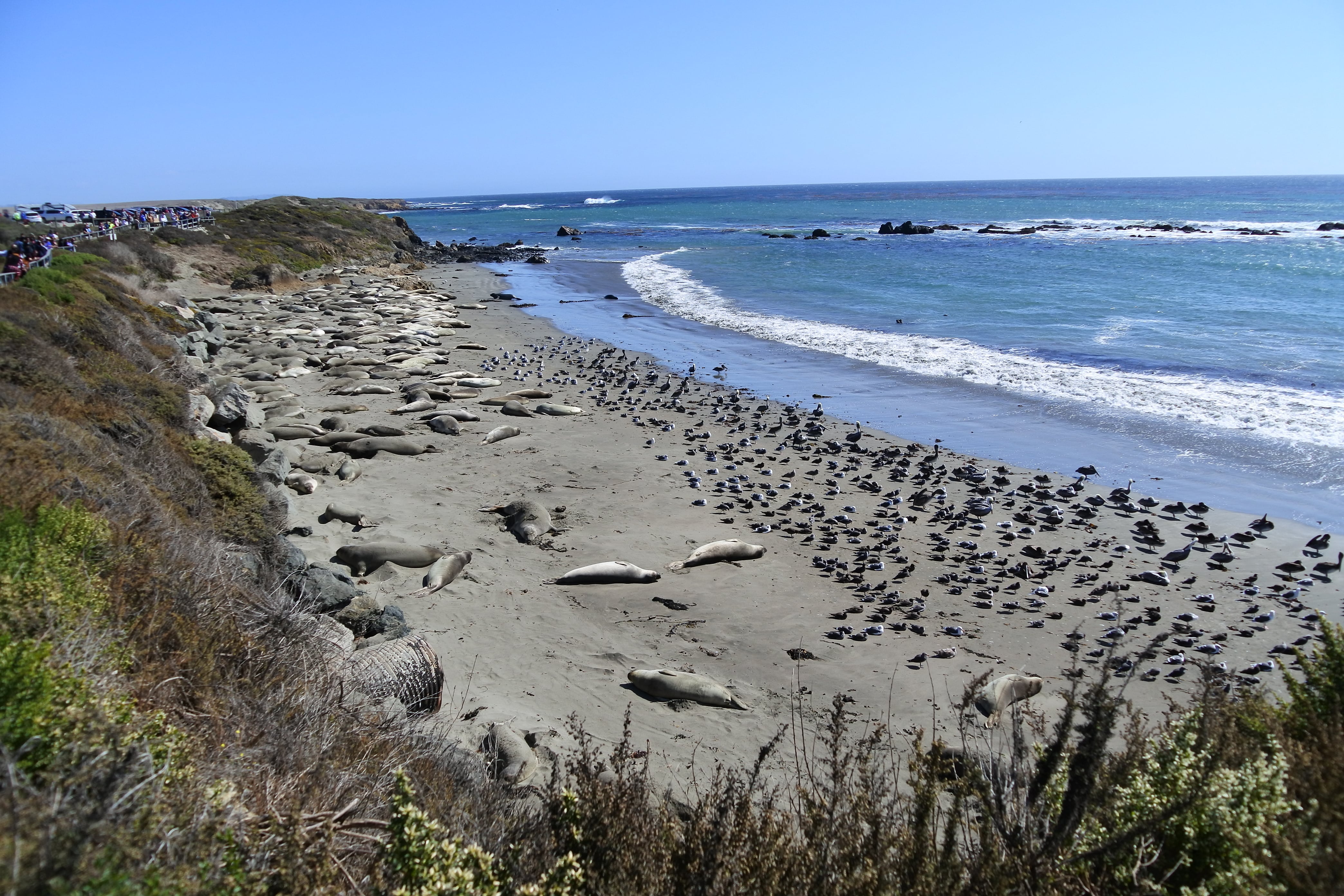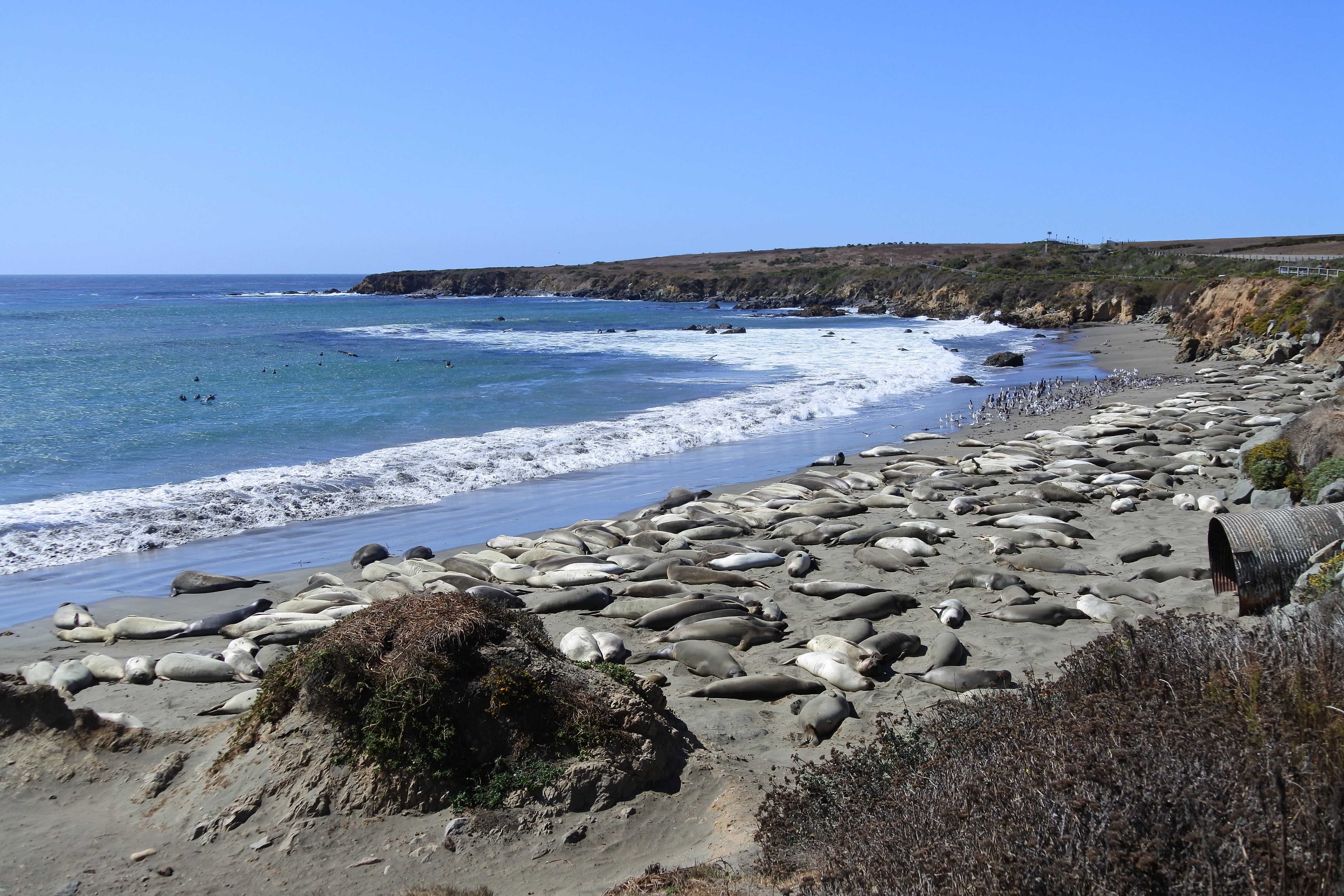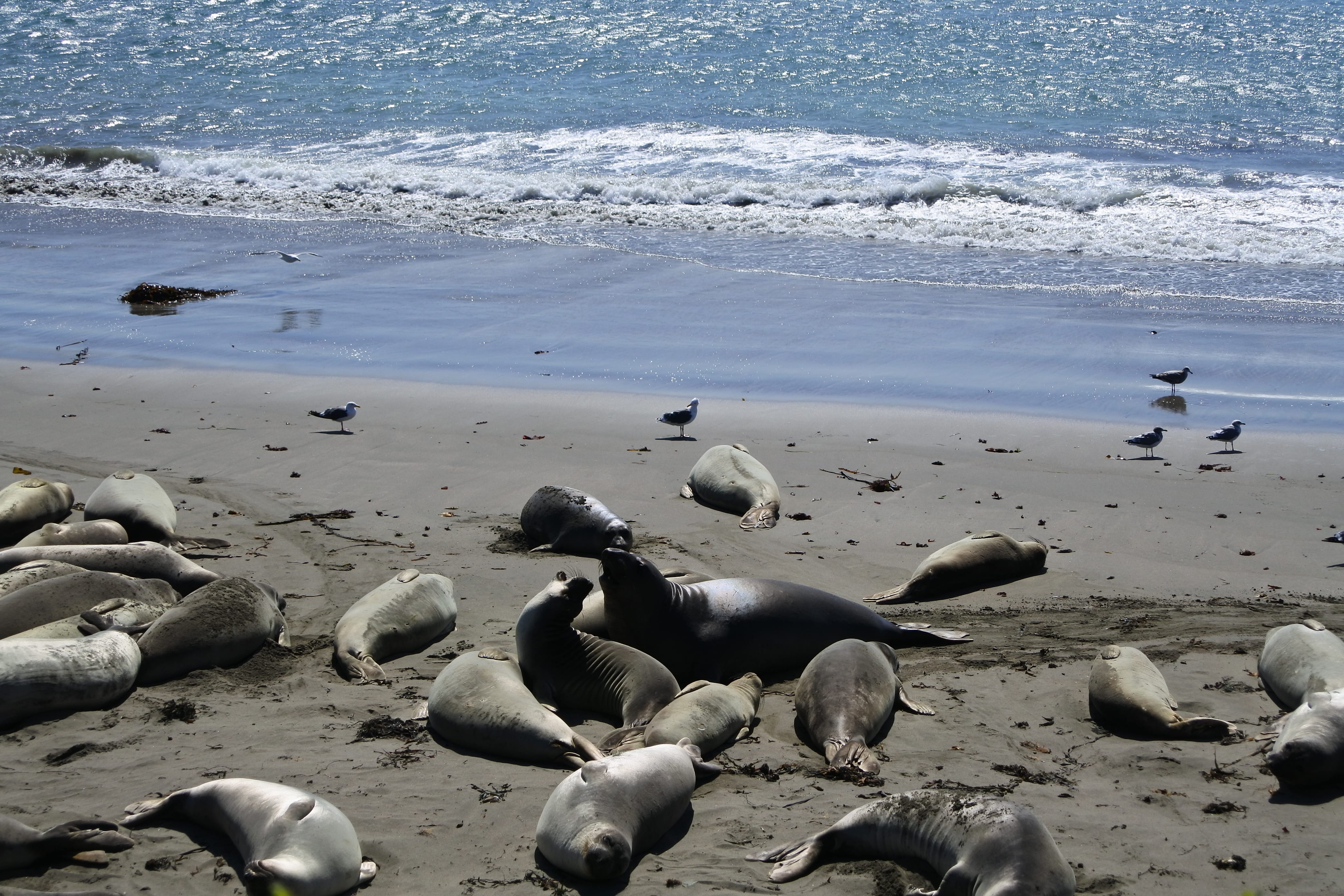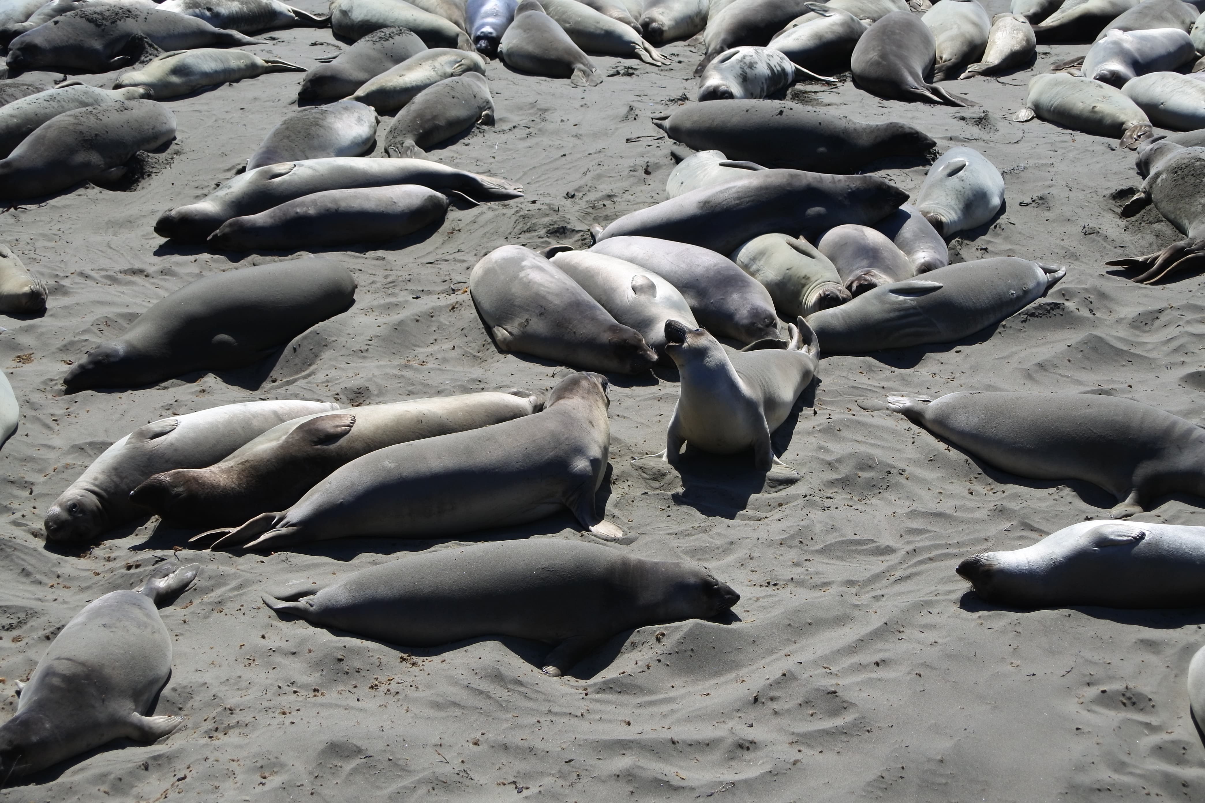 Nous reprenons ensuite la route le long de la côte Pacifique, toujours aussi belle et ensoleillée mais sous un vent de plus en plus froid, direction San Simeon. C’est une petite ville côtière qui a la particularité de servir toute l’année de point de chute aux éléphants de mer qui descendent depuis l’Alaska pour se reproduire dans les eaux chaudes de la Californie. On y trouve donc une petite plage remplie de ces animaux très sympathiques, mais un peu encombrants puisque les plus gros peuvent atteindre les 5m de long et peser jusqu’à 3 tonnes ! A cette époque de l’année nous n’avons eu sous les yeux que les jeunes adultes, chez qui la « trompe » n’est pas encore développée mais dont la corpulence est déjà très imposante. Par contre niveau activité : zéro ! Les 200 individus que nous avons eu sous les yeux passent leur temps à dormir les uns sur les autres ou a s’envoyer du sable sur le dos (on ne sait même pas pourquoi, sans doute pour se protéger du soleil). Ça reste quand même pour nous une superbe rencontre, et nous avons passé deux bonnes heures à les regarder, et les écouter (comme un concert géants de bruits en tout genre) 😉